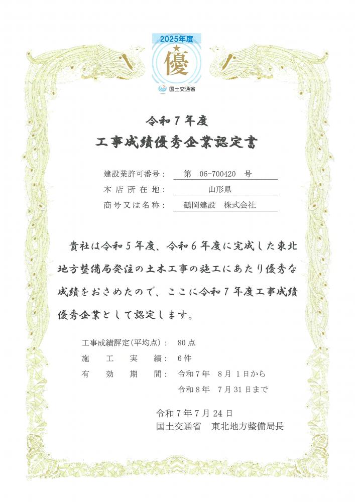 当社は、国土交通省東北地方整備局より令和7年度「工事成績優秀企業」として昨年に引続き認定され
