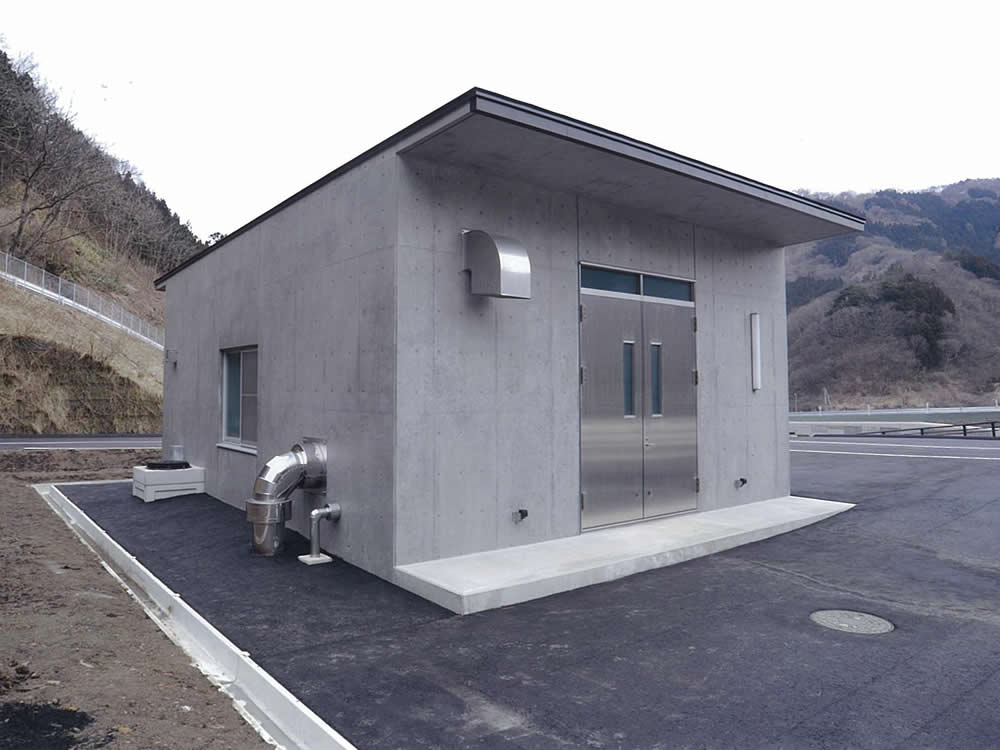 平成24年3月に日本海東北自動車道あつみ温泉IC〜鶴岡JC間が開通。東北で2番目に長いあつみトンネルを有する自動車道の五十川IC側の電気室建築工事を当社が施工しました。外観はコンクリート打ち放しの仕上げのため、配筋、型枠はもとより、コンクリートの打設には最善の工夫や技術を駆使し作業にあたりました。