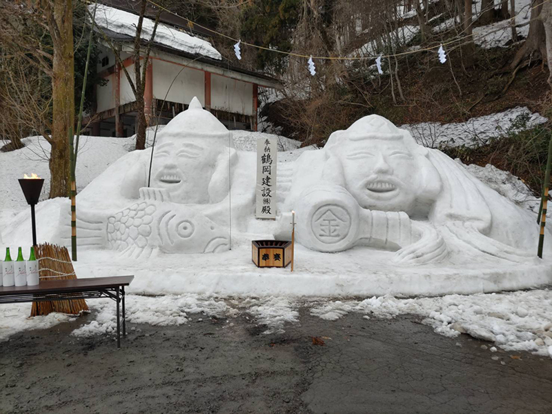 当社ではお祭りのシンボルとして、毎年、大黒様と恵比須様の大きな雪像を奉納しており、